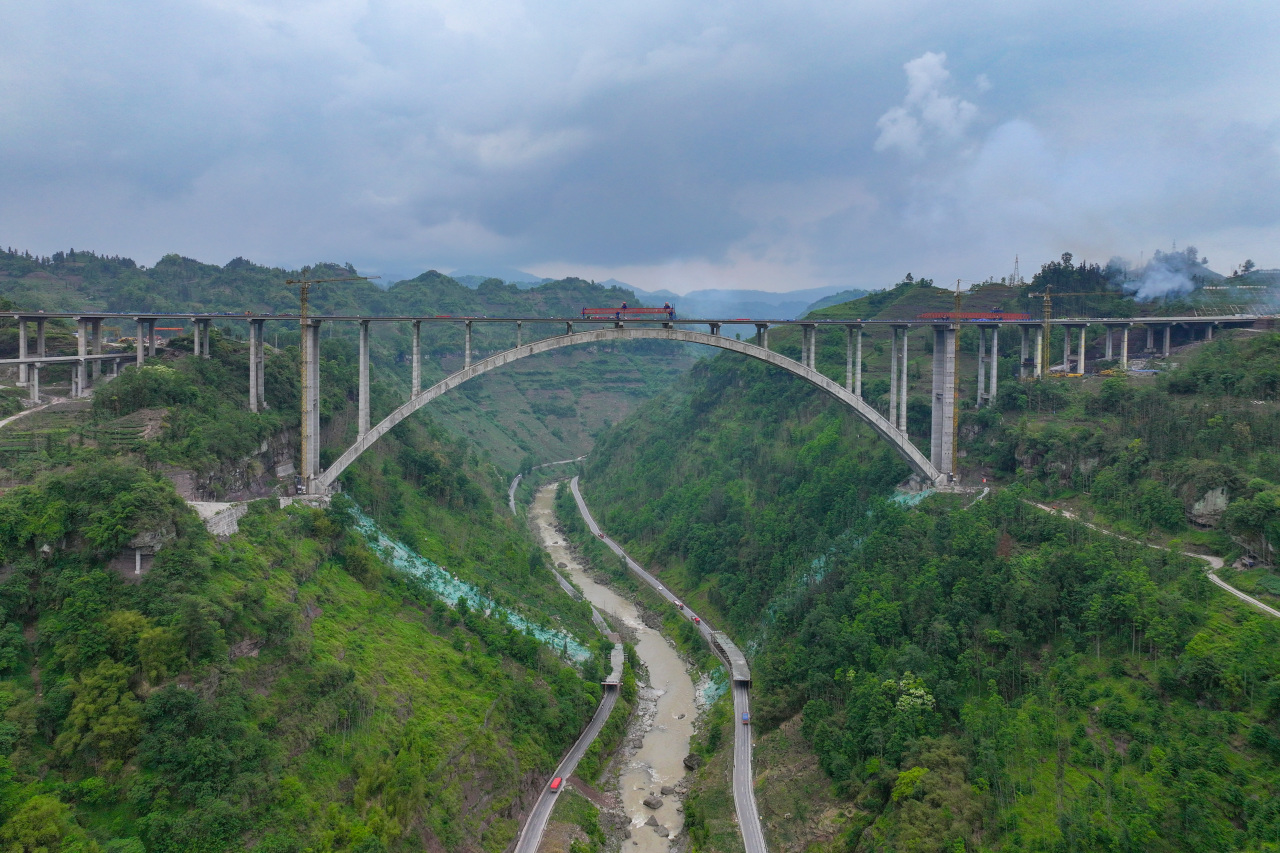 在進(jìn)度上,通過精細(xì)化施工組織、精密化鋼結(jié)構(gòu)制造、精準(zhǔn)化吊裝就位及專業(yè)化施工班組等措施,加工及吊裝工期由原計劃的三個月縮短至兩個月,創(chuàng)造了同類型橋梁勁性骨架吊裝行業(yè)新速度。通過超前籌劃混凝土配制試驗、科學(xué)組織現(xiàn)場施工生產(chǎn)、強(qiáng)化施工過程質(zhì)量管控,蘇壩特大橋鋼管拱混凝土灌注工期縮短至19天,較原計劃提前20天,助力蘇壩特大橋建設(shè)跑出新速度;