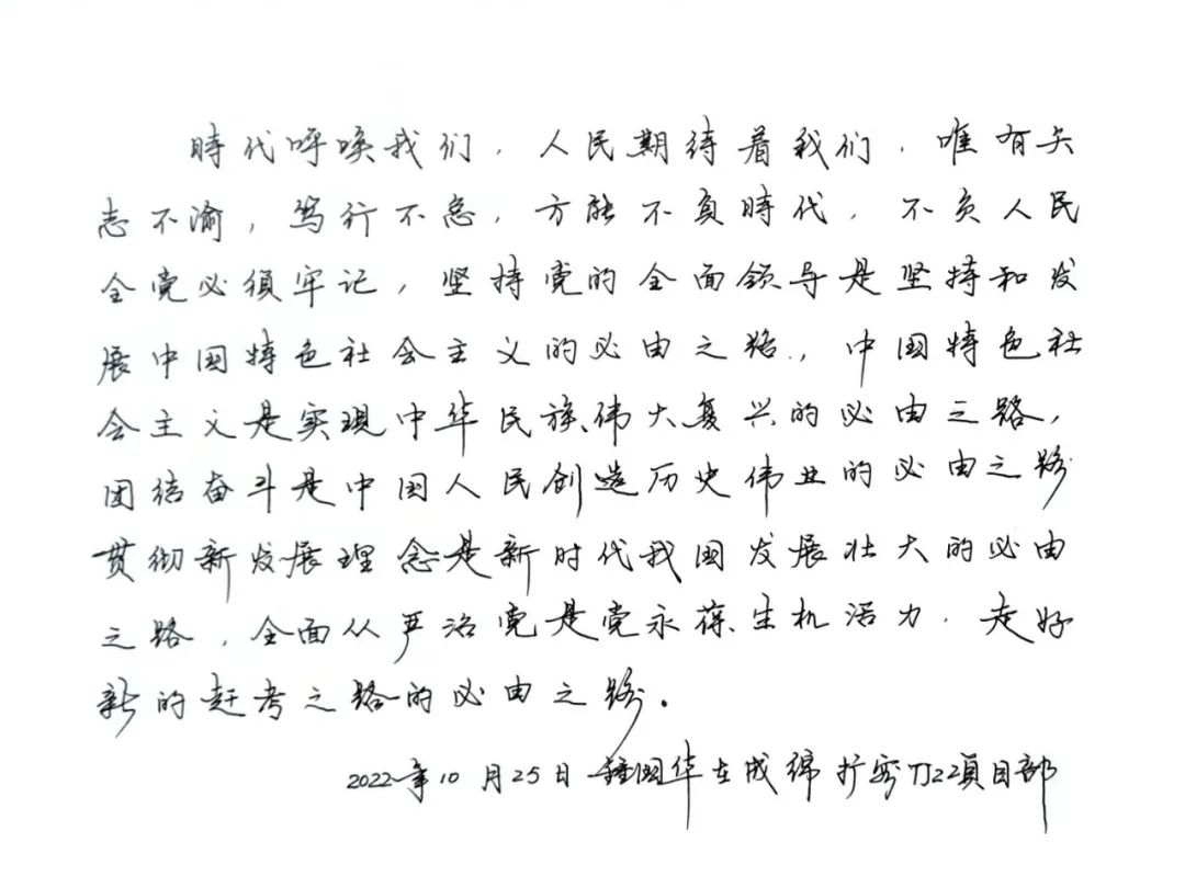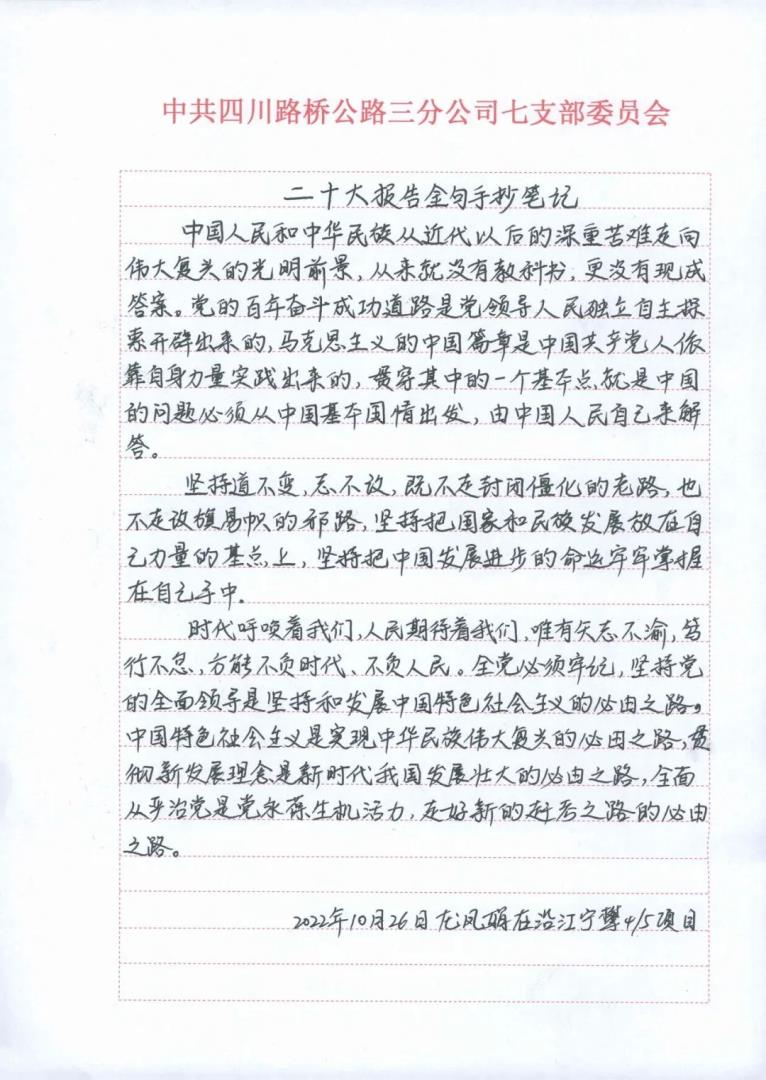 近日,四川路橋各直屬企業(yè)黨組織積極開展“手抄黨的二十大金句”活動(dòng),廣大黨員干部職工通過邊抄、邊記、邊學(xué)的方式,真正做到了把黨的二十大報(bào)告精神學(xué)全、學(xué)深、學(xué)透。